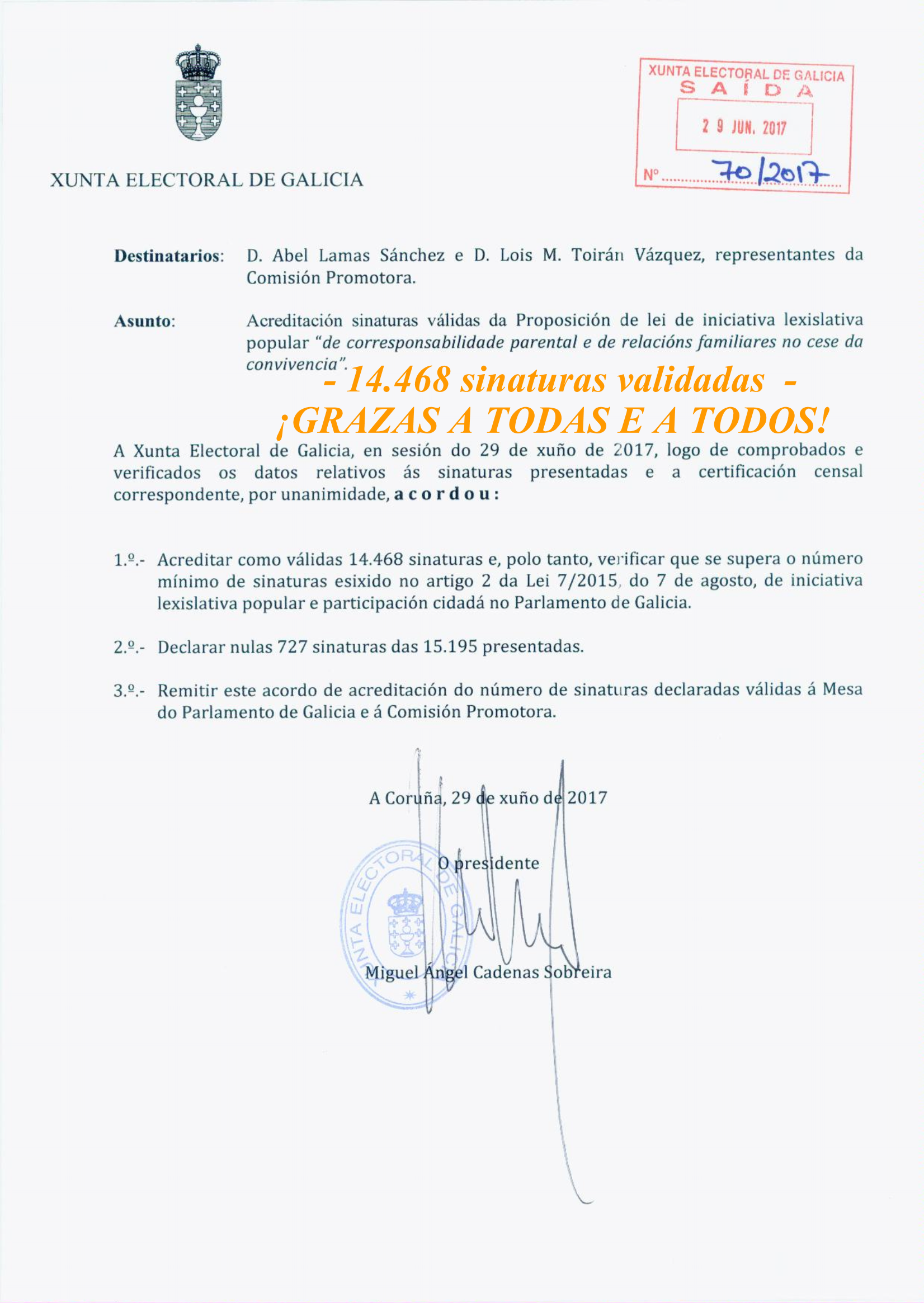 A Xunta Electoral de Galicia, en sesión do 29 de xuño de 2017, logo de comprobados e verificados os datos relativos ás sinaturas presentadas e a certificación censal correspondente, por unanimidade, acordou acreditar como válidas 14.468 sinaturas e, ...